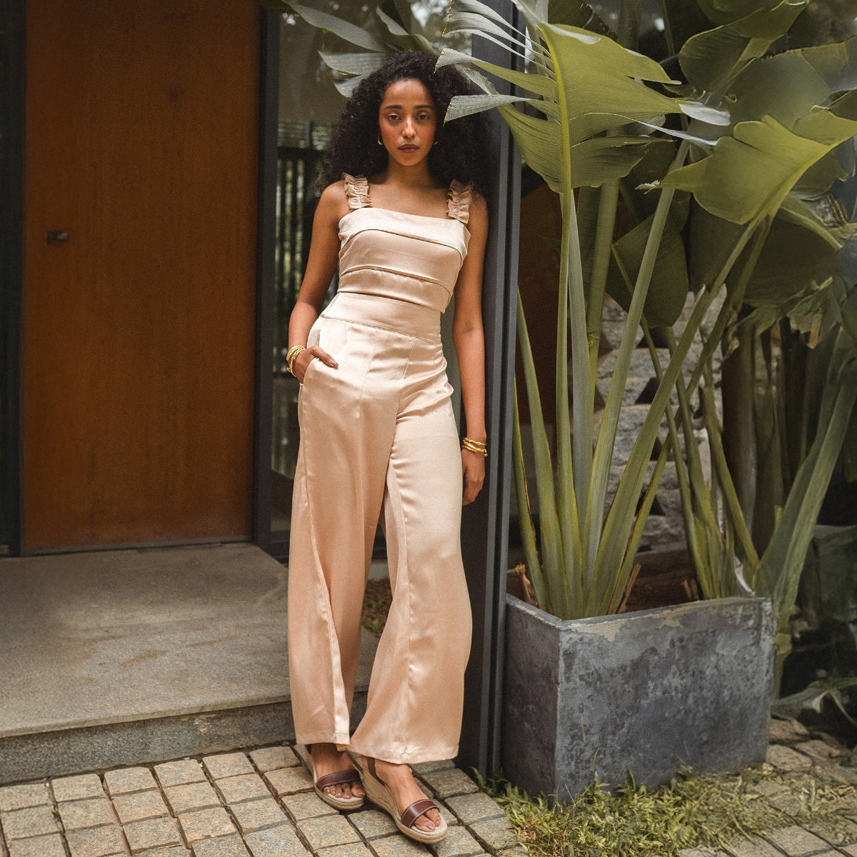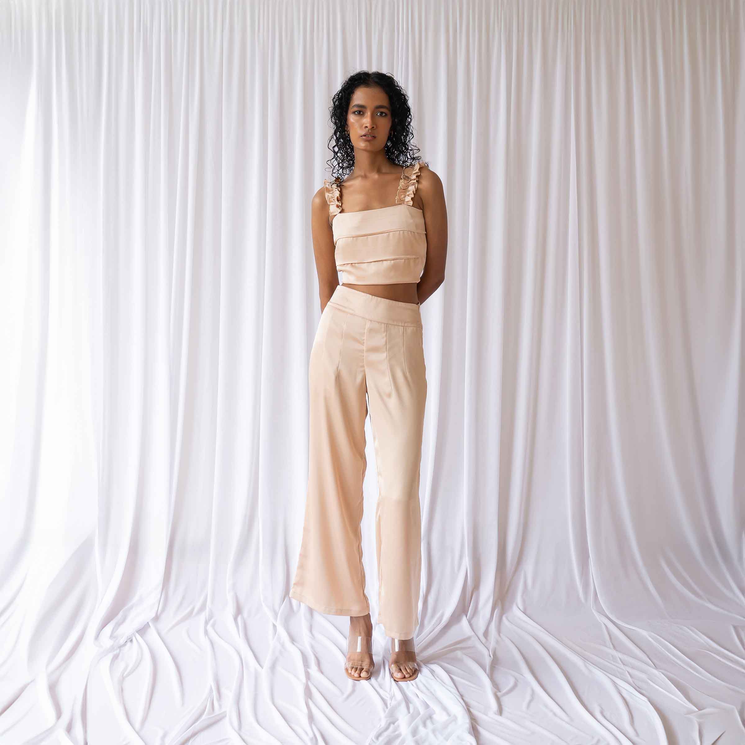 Designed as the kind of co-ord you can dress up or dial down, it balances softness with structure effortlessly. Crafted in fluid polysatin, the top sits light on the body, with frilled straps adding a gentle, feminine edge. Fitted yet flexible, it moves with you through long days, late dinners, and everything in between. Handmade in small batches, it’s a quiet essential with lasting presence.