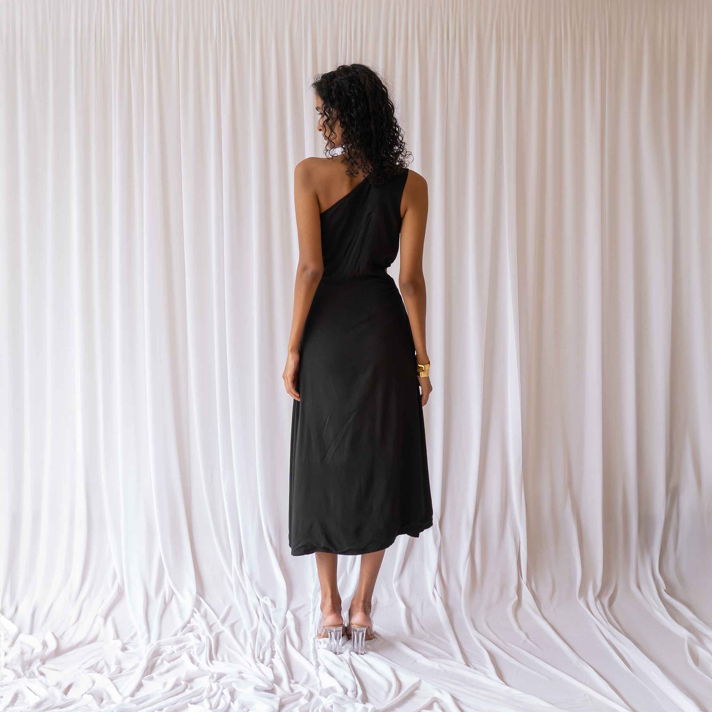 With a one-shoulder shape, a round waist cutout, and a clean leg slit, the Arwen Dress balances allure with restraint. Nothing is excessive, yet everything is intentional. Crafted in a soft, breathable viscose–rayon blend, it drapes lightly against the skin. The black finish keeps it timeless, sophisticated, and ready for evenings that ask you to feel like your most effortless self. Handmade in small batches by an equal-opportunity unit in Bangalore, the dress holds confidence in its craft too; calm in presence, refined in detail, and designed to last beyond the moment.
