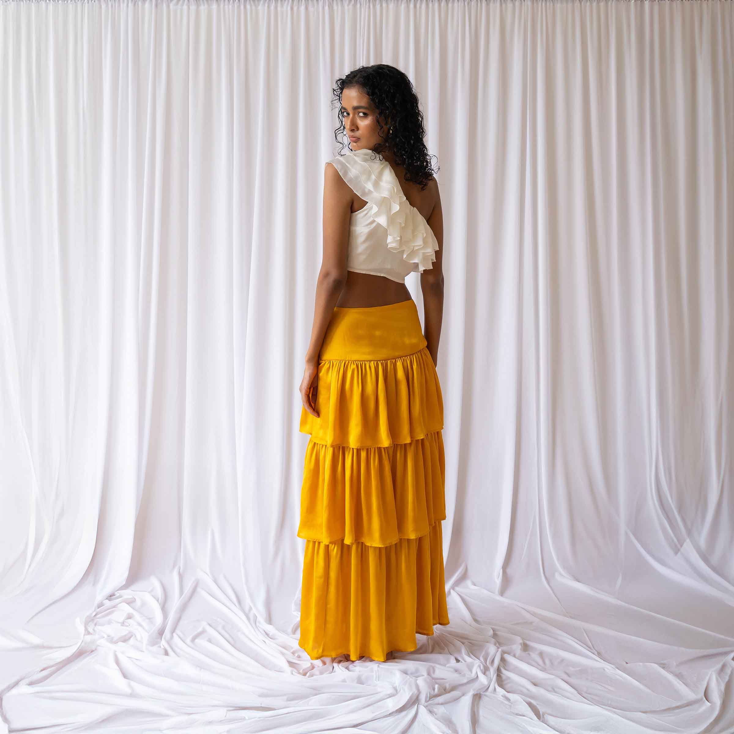 Its yellow polysatin drapes with a soft, effortless fall, catching light in a way that feels playful but never loud. The tiered silhouette adds movement, rhythm, and that breezy femininity you only get from a skirt made to twirl. With its true-to-size fit and flowy structure, it complements most body types with ease. Handmade in small batches, it’s built for joy, bright in colour, light on the skin, and designed to last through holidays, beach days, and every moment you want to feel just a little brighter.
