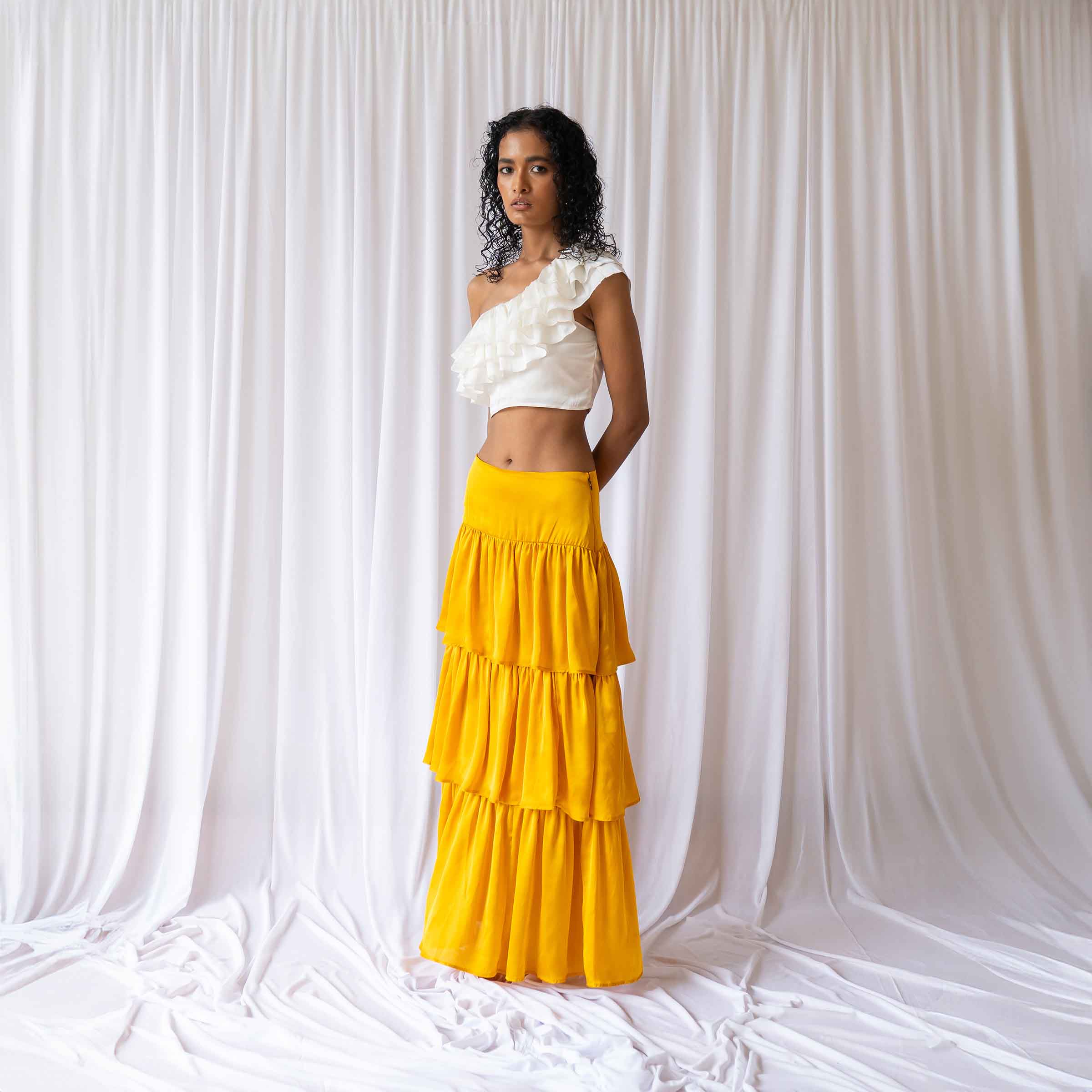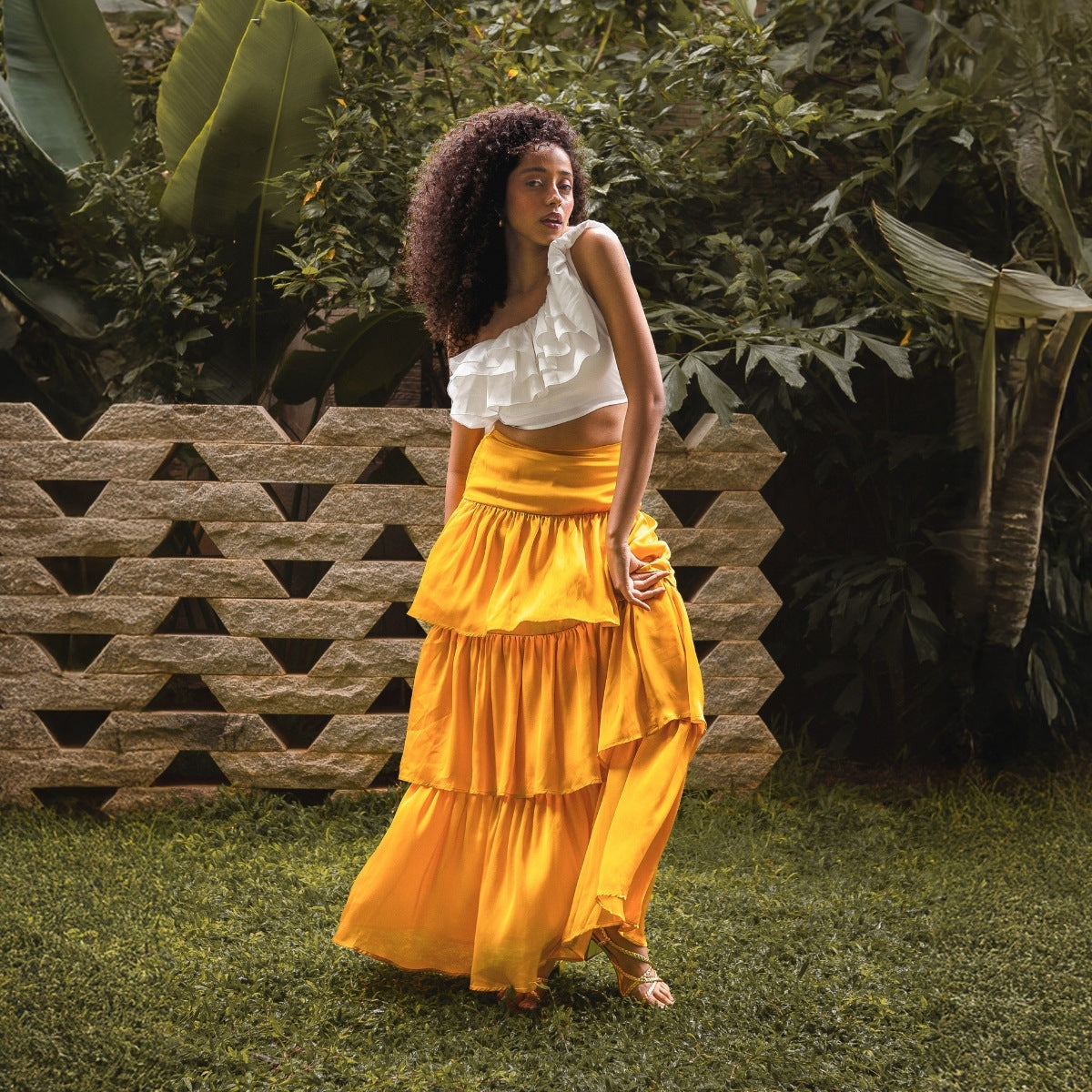 Its one-shoulder frill layers create a soft, sculpted movement, making it feel breezy without ever losing shape. Crafted in lightweight polysatin, it drapes with a soft sheen and moves easily with the body. Fitted through the bodice and finished without lining for a light, airy feel, it’s a piece designed for warm days, happy energy, and vacation stories waiting to be lived. Handmade in small batches, every Blair Top is crafted with intention, playful in spirit, refined in detail.